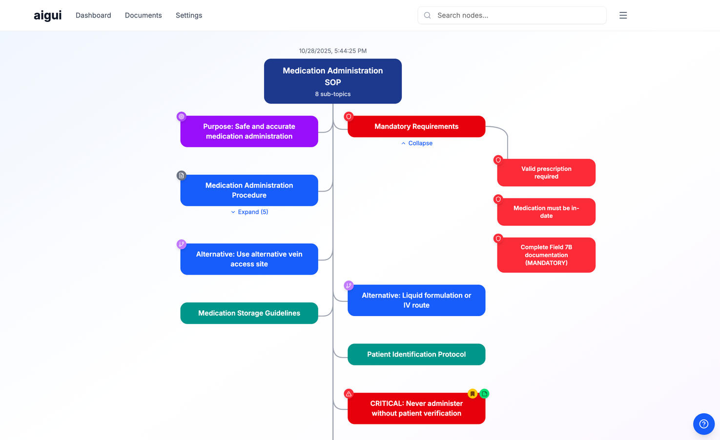 Every node is color-coded by importance and type. Red warnings, green actions, purple key points. Your team knows exactly where to focus attention.